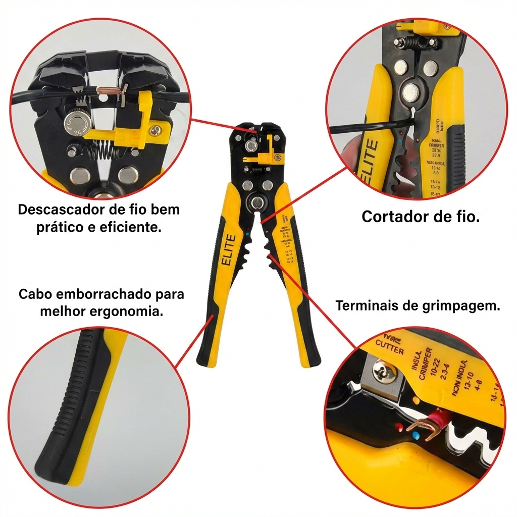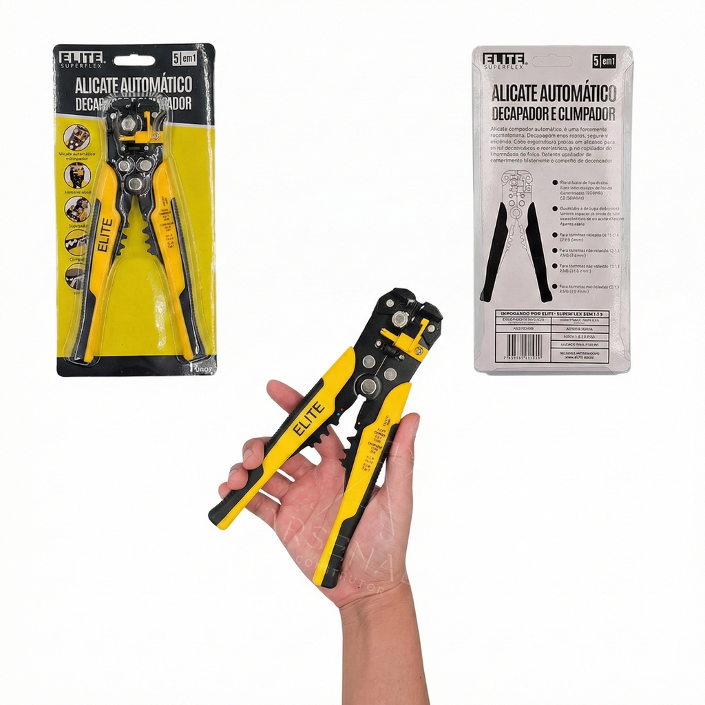 O Alicate Automático Decapador e Crimpador 5 em 1 Elite é uma ferramenta multifuncional ideal para eletricistas, instaladores e profissionais de manutenção. Projetado para agilizar o trabalho, ele ajusta automaticamente à bitola do fio, permitindo desencapar cabos com precisão sem danificar o condutor.