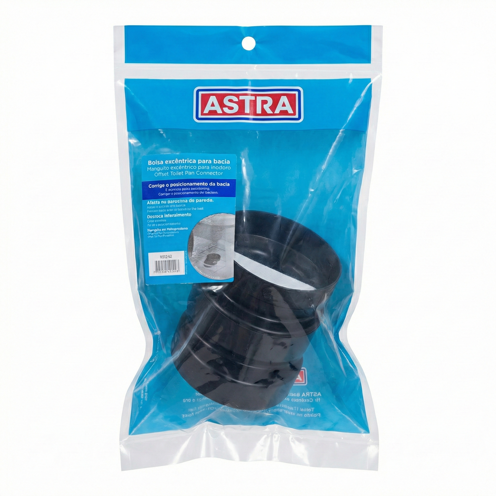 Diferente das bolsas de vedação comuns (que são totalmente retas e centralizadas), o modelo excêntrico da Astra possui uma angulação interna. Essa engenharia simples permite que o instalador corrija falhas milimétricas deixadas na hora de concretar o tubo de esgoto no contra-piso, evitando que o vaso sanitário fique torto em relação à parede.