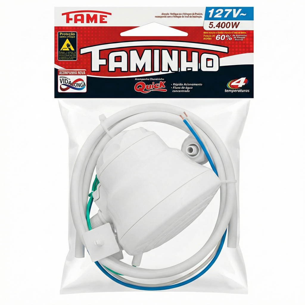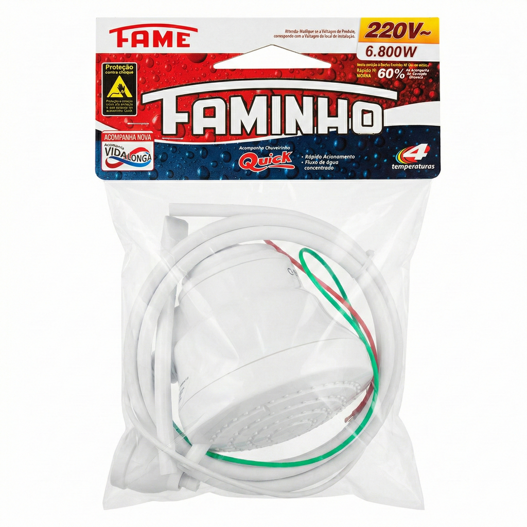 A Ducha Fame Nova Faminho 4T Branca reúne a tradição da marca Fame com a tecnologia moderna de aquecimento. Conhecida pela sua durabilidade e eficiência, esta ducha é a escolha ideal para quem procura um banho relaxante com grande volume de água e controle preciso de temperatura.