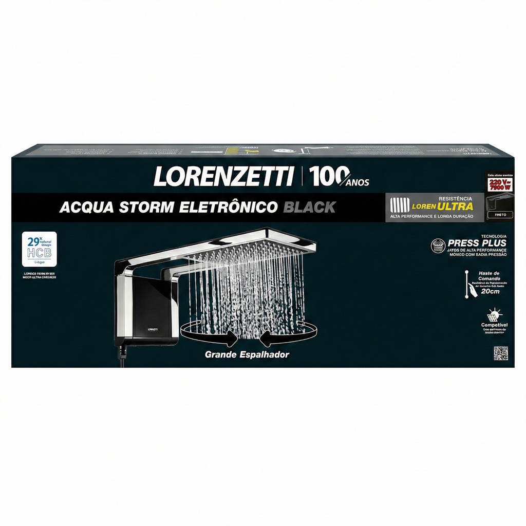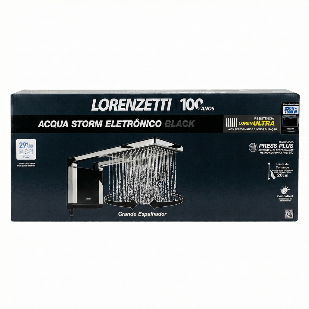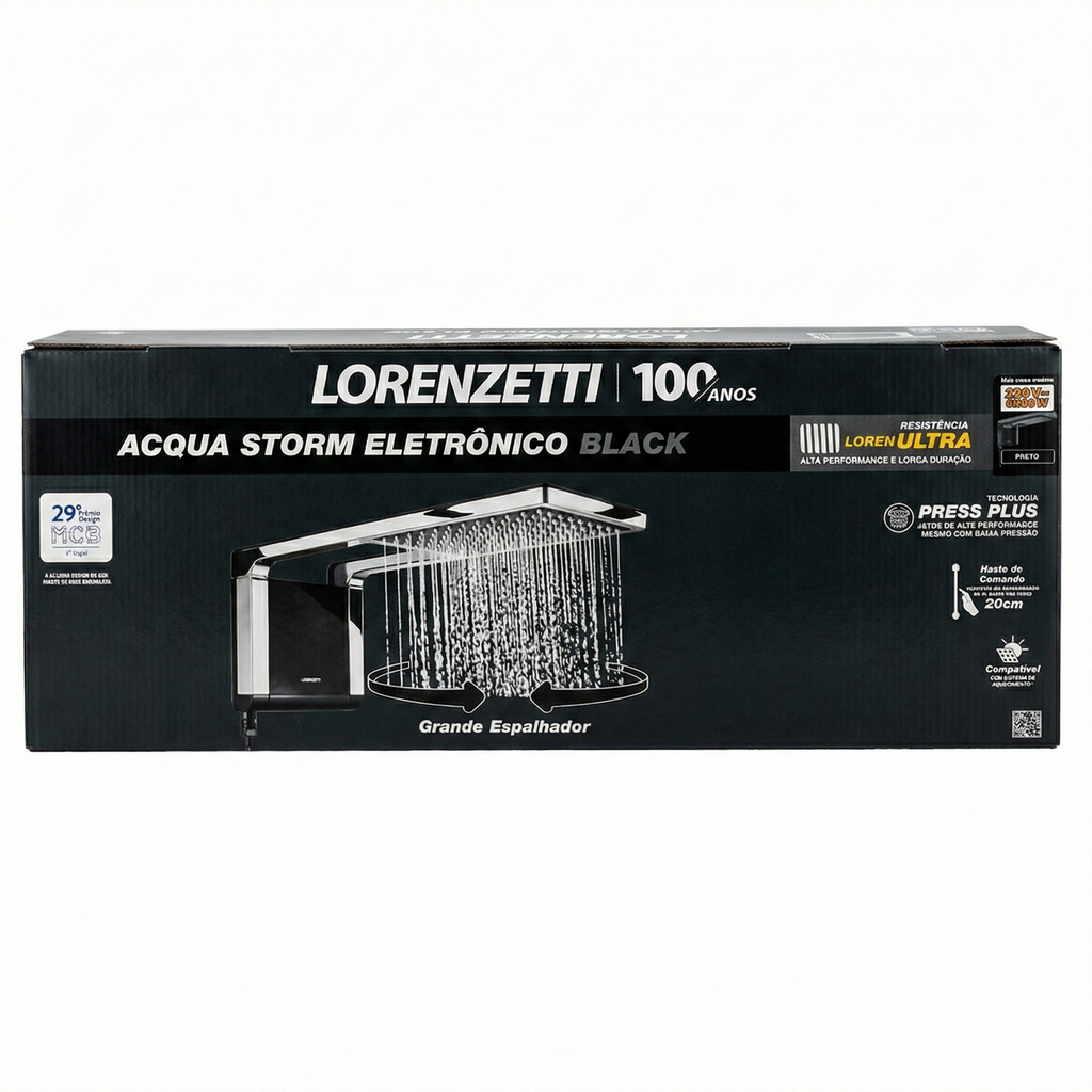 Além da estética premiada, a Acqua Storm conta com a exclusiva tecnologia Press Plus, que garante jatos de água de alta performance mesmo em casas com baixa pressão. O seu Comando Eletrônico permite a escolha gradual e precisa da temperatura através de uma haste ao alcance das mãos. Equipada com a Resistência Loren Ultra (tipo cartucho plano), oferece uma durabilidade muito superior às resistências comuns.