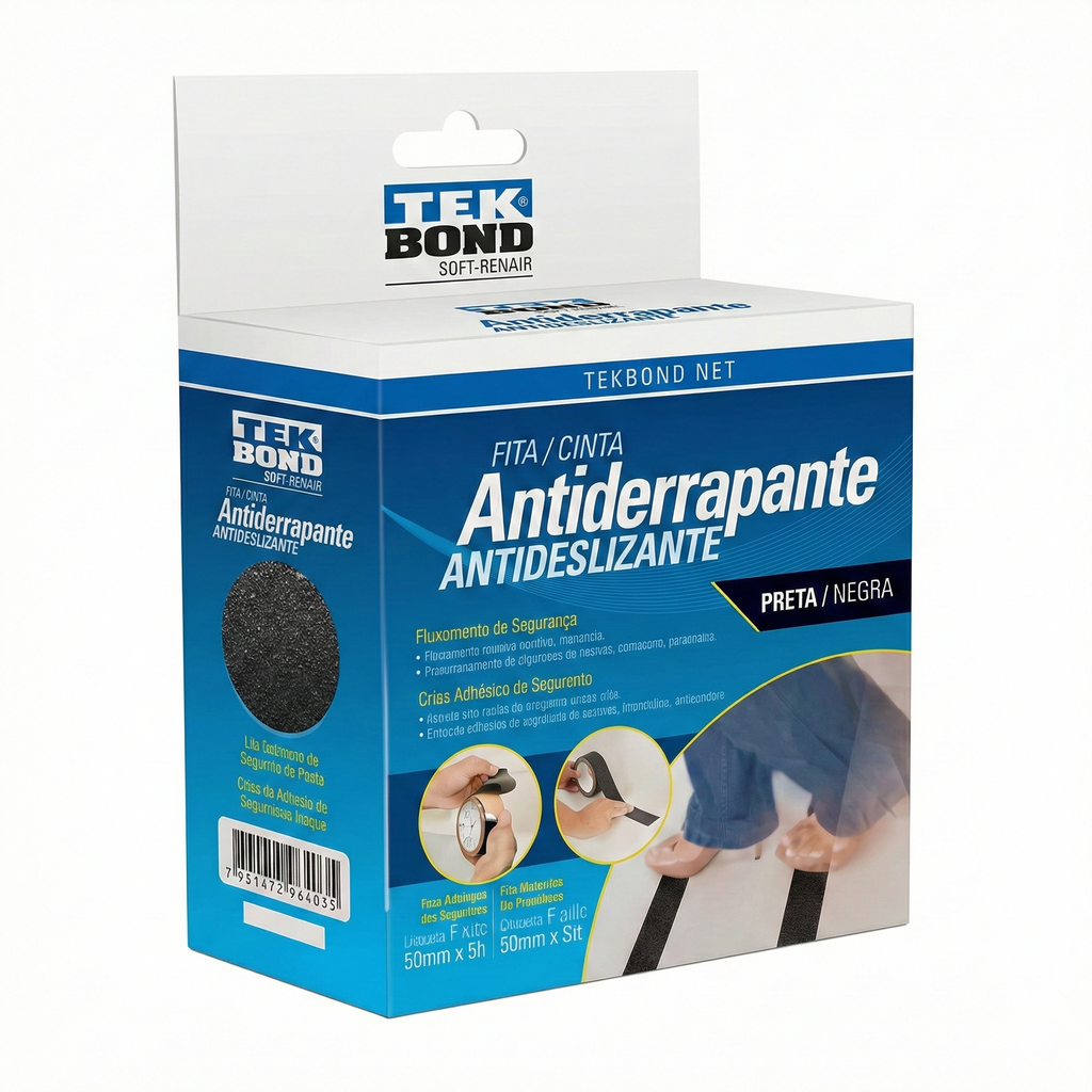 A Fita Antiderrapante Tekbond é a solução profissional para prevenção de quedas e escorregões em escadas, rampas e superfícies lisas. Desenvolvida com tecnologia à base de sílica e filme de poliéster, oferece coeficiente de fricção superior a 6µ, garantindo máxima aderência e segurança em ambientes residenciais, comerciais e industriais.