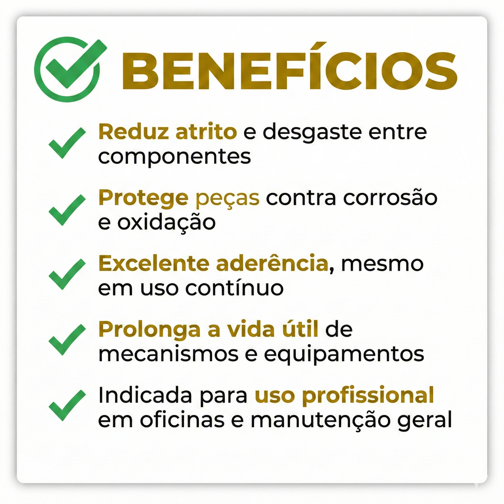 Redução Drástica de Atrito: Prolonga a vida útil de eixos, engrenagens e articulações, evitando o desgaste prematuro.
