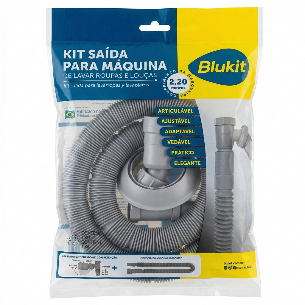 Acabe com as gambiarras, vazamentos e o mau cheiro na sua lavanderia ou cozinha! O Kit Saída para Máquina da Blukit (Ref. 030459) é a solução definitiva e elegante para o escoamento de água de máquinas de lavar roupas e lava-louças.